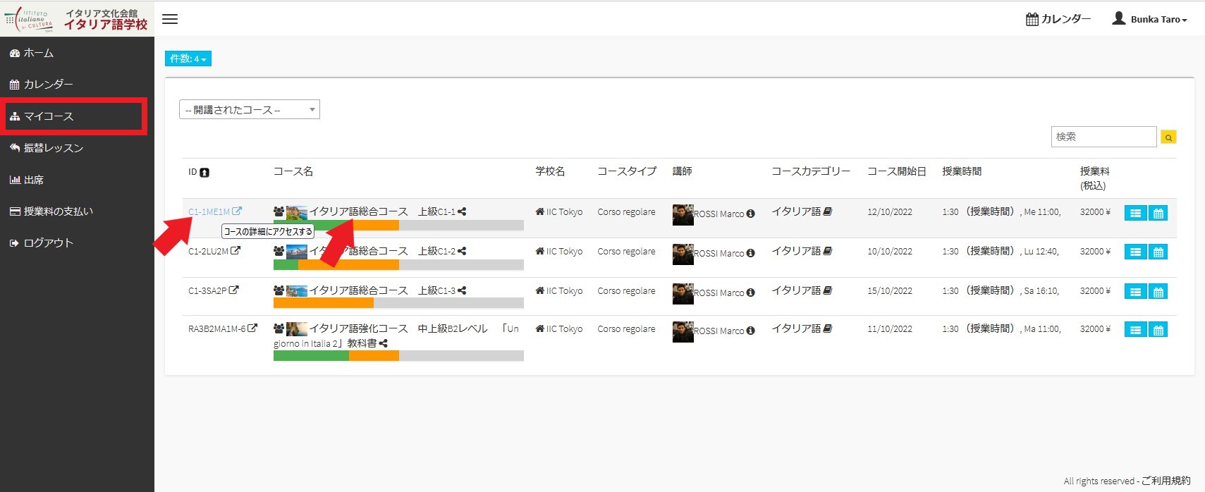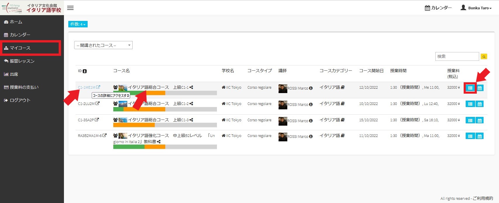 表示される「コース情報」のページ内から、下記の重要な情報を確認することができます。