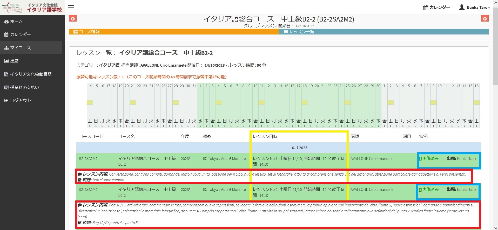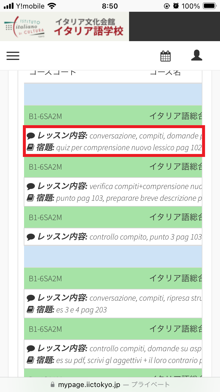 赤い枠:吹き出しマークは各レッスンで講師が教えた内容が、教科書マークは教師が宿題として出した課題が表示されています。