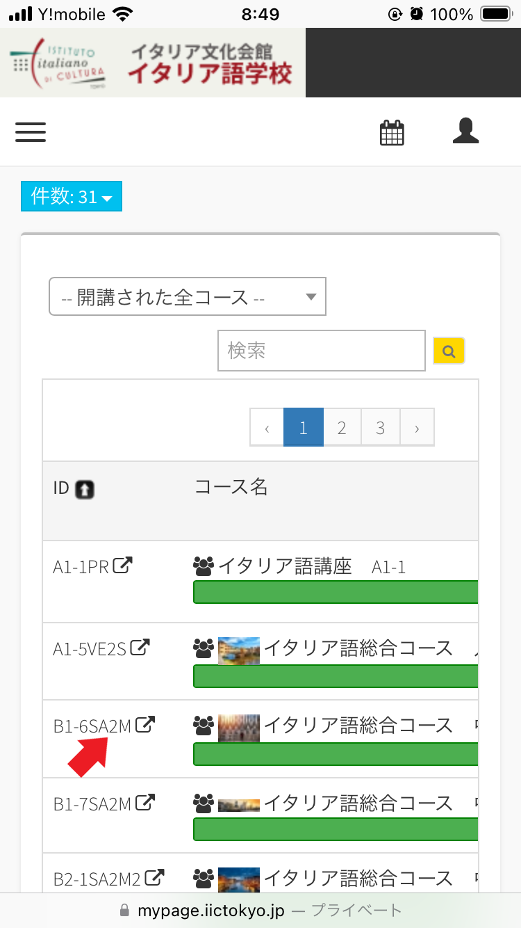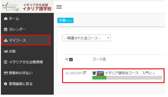 受講生アカウントMy Pageにアクセスして、メニューの「マイコース」よりお申込みされたコースを探して、クリックしてください。