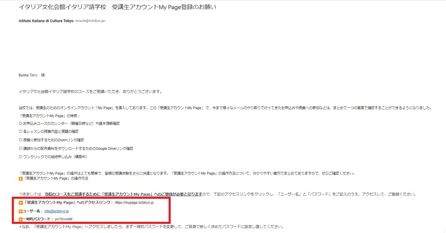 上記『❶「コース成立と授業参加方法のお知らせ」を受け取る』のメールを受け取ってから、数時間以内に「受講生アカウントMy Page登録のお願い」のメールも届きます。
