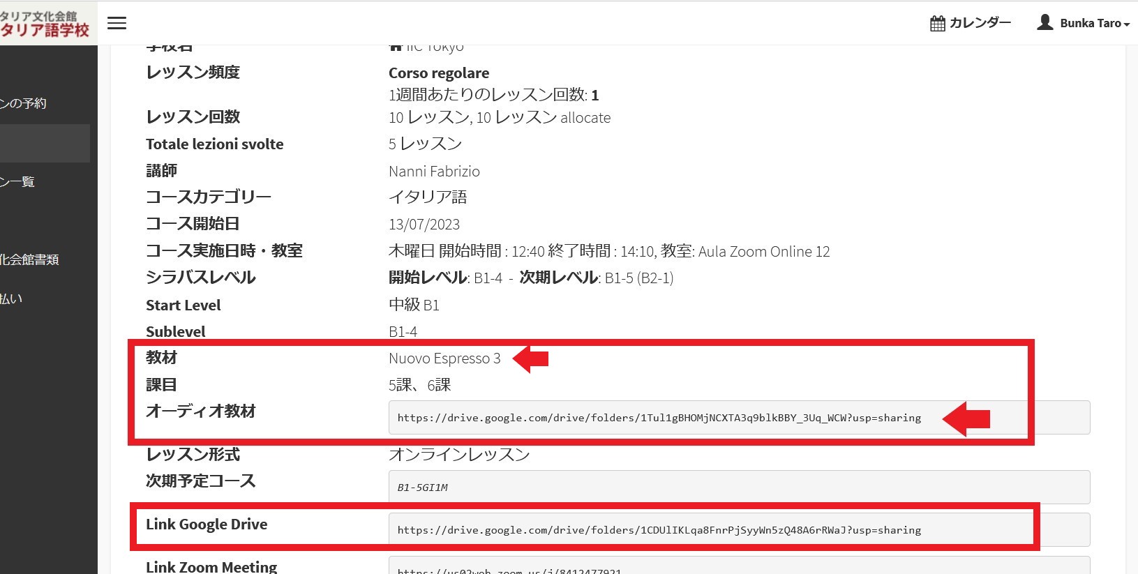 –オーディオ教材 ⇒ 教科書が使用されている場合、その教科書の音声ファイルが表示されるリンク先のGoogleDriveのフォルダーで受講生と共有して、ダウンロードすることができます。